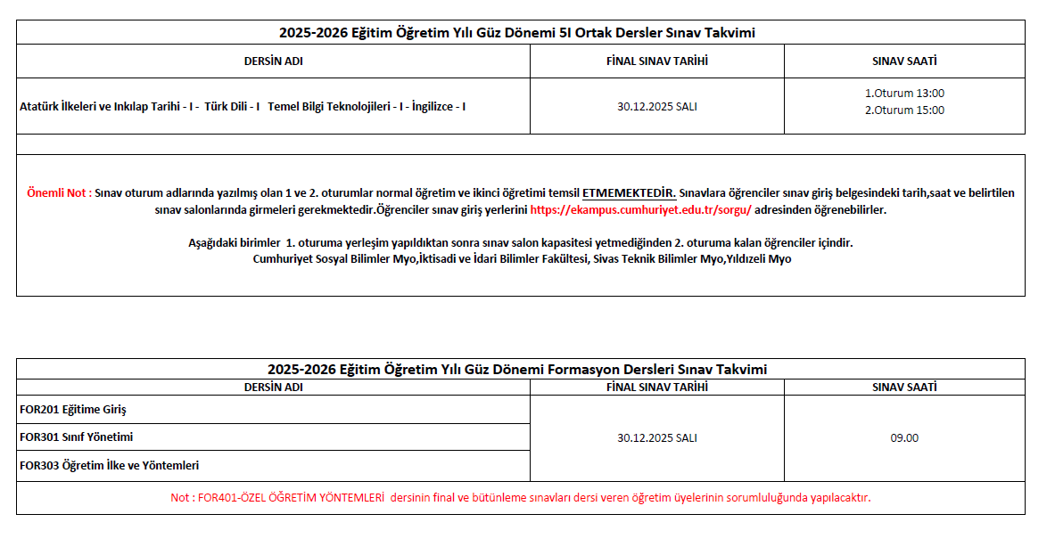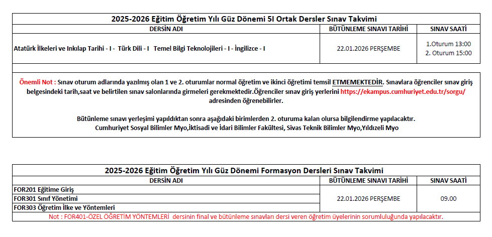 2025-2026 Eğitim Öğretim Yılı Güz Dönemi 5I Ortak Dersler Sınav Takvimi (Final-Bütünleme)