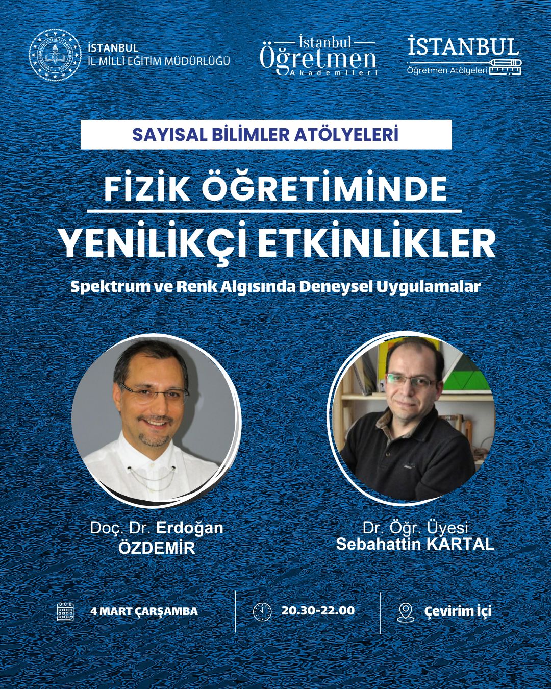 Sivas Cumhuriyet Üniversitesi Sağlık Hizmetleri Meslek Yüksekokulu öğretim üyeleri Doç. Dr. Erdoğan Özdemir ve Dr. Öğr. Üyesi Sebahattin Kartal, İstanbul İl Milli Eğitim Müdürlüğü koordinasyonunda düzenlenen “Sayısal Bilimler Atölyeleri: Fizik Öğretiminde Yenilikçi Etkinlikler” başlıklı çevrimiçi programa davetli konuşmacı olarak katıldı.